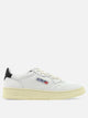 Autry "Medalist Low" sneaker with uniformly textured, natural leather upper featuring microhole work on the toe. The construction features a low-profile silhouette with a padded collar for added comfort and support. The laces are flat cotton, and the tongue is finished with embroidery label applied via exposed stitching. The inner lining combines leather and cotton terry, contrasting molded rubber sole.