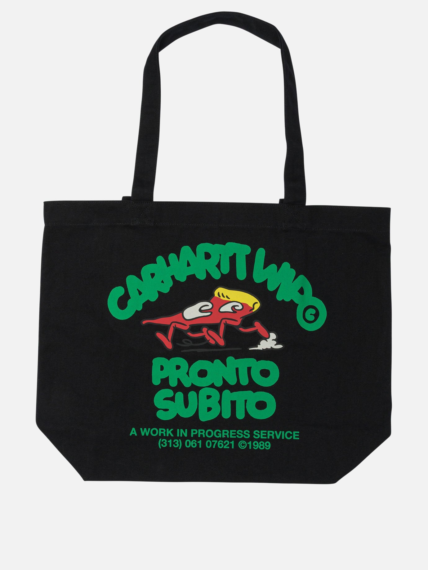 Carhartt WIP "Canvas Graphic" tote bag, made of Dearborn cotton canvas. The structure features a soft and spacious silhouette. Devoid of inner lining and equipped with reinforced inner border. Graphic print decorates the front panel. A movable inside pocket adds functionality, while the flag label is sewn on the outside.
