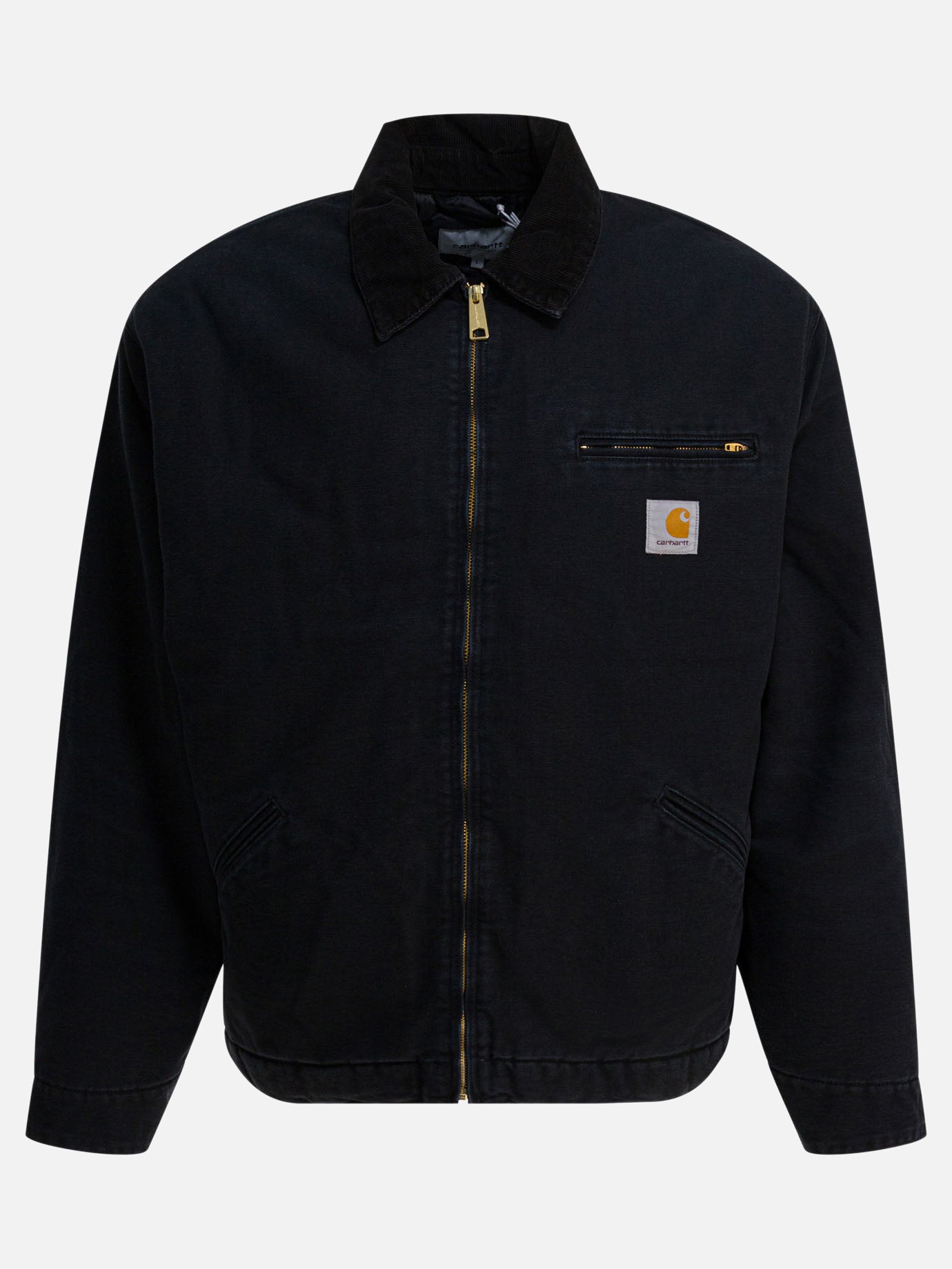 Carhartt WIP "OG Detroit" jacket made from organic cotton Dearborn canvas. The construction features a loose fit with matelassé lining and a corduroy collar. Triple topstitching reinforces points subject to increased wear. Front zipper closure, custom snaps, and adjustable elastic cuffs and hem. Front zipper pocket, dropped-shoulder silhouette and square chest label.