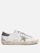 Golden Goose "Super-Star" sneakers with upper made of cowhide leather. The silhouette features a low-top construction, with a rear suede insert applied to the heel. The inner lining is made of mixed material, while the fit is shaped by a rubber sole. The upper includes a side-applied star and metal lettering details. The entire construction receives a vintage treatment that gives a lived-in texture.