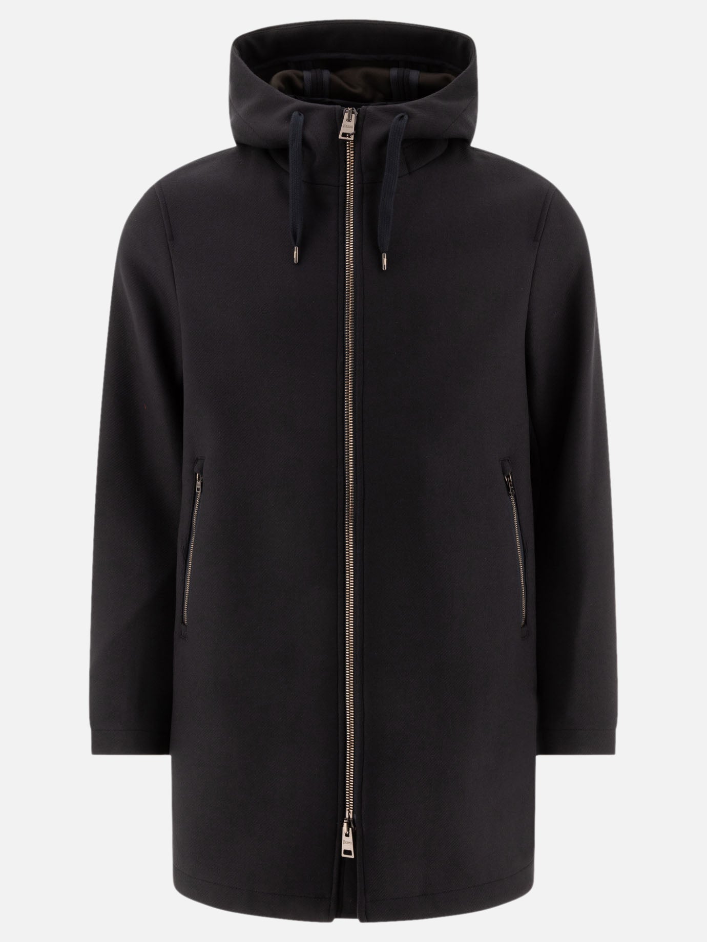 - Navy blue virgin wool blend hooded coat