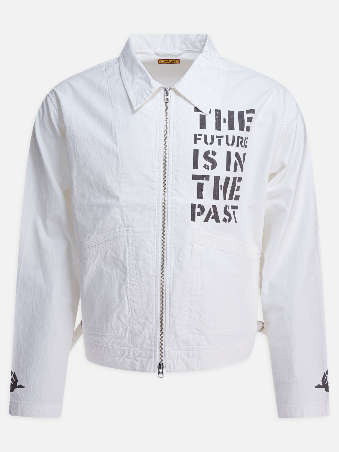 Human Made's signature navy jacket is a garment that combines elegance and boldness. Made of durable canvas fabric, it is distinguished by stencil-style graphics that give the look a contemporary, gritty appeal. The "The future is in the past" print and the logo printed on the back emphasize its unique and unmistakable identity.
