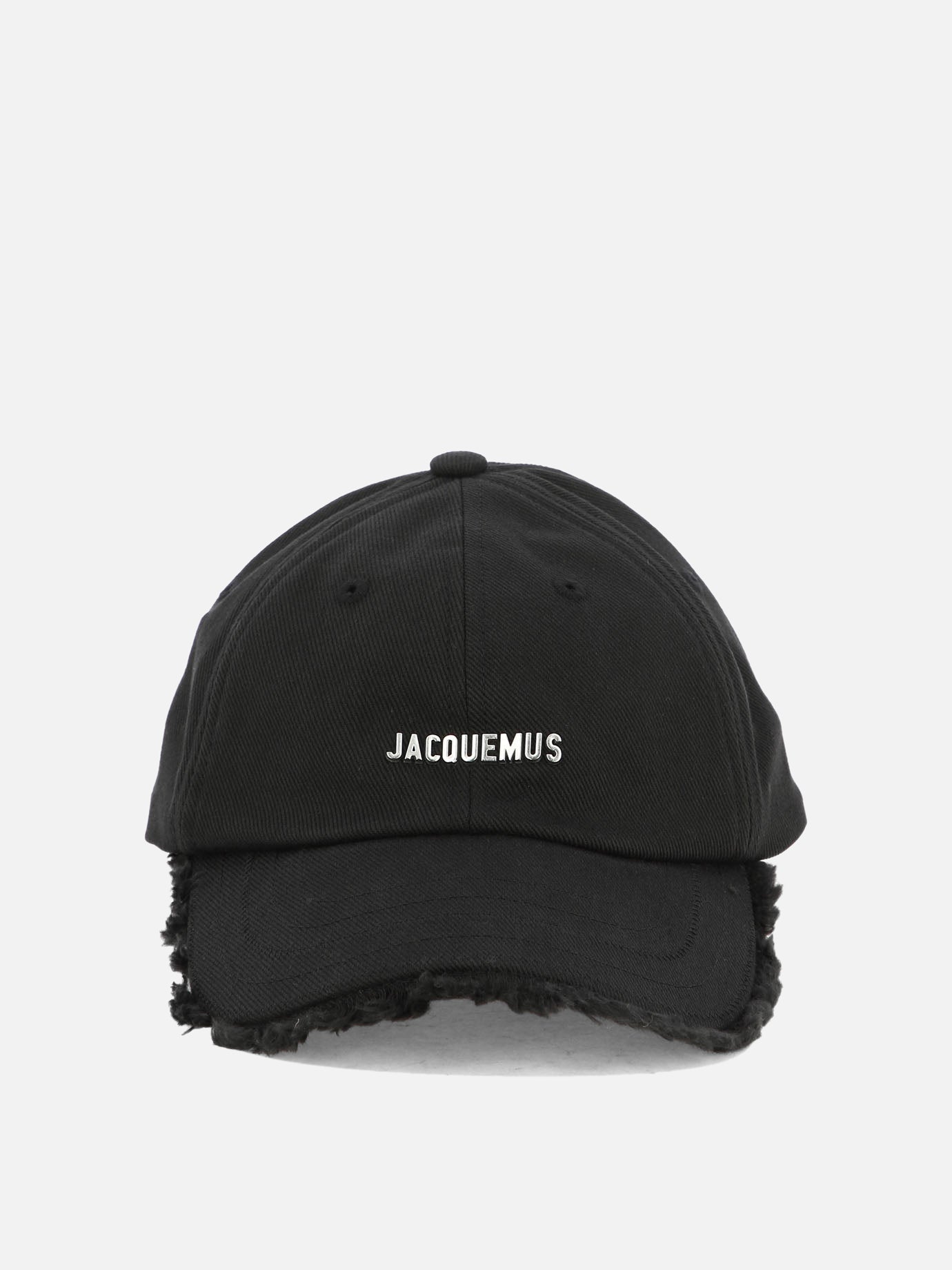 Jacquemus "Artichaut" trucker hat constructed with textured panels and a rigid brim. It features an ergonomic silhouette with frayed edges and visible stitching on the brim. The back strap has an adjustable metal buckle closure, offering a customizable trim. The hat integrates functional details such as a waterproof surface and decorative bangs distributed along the edges for differentiated texture.