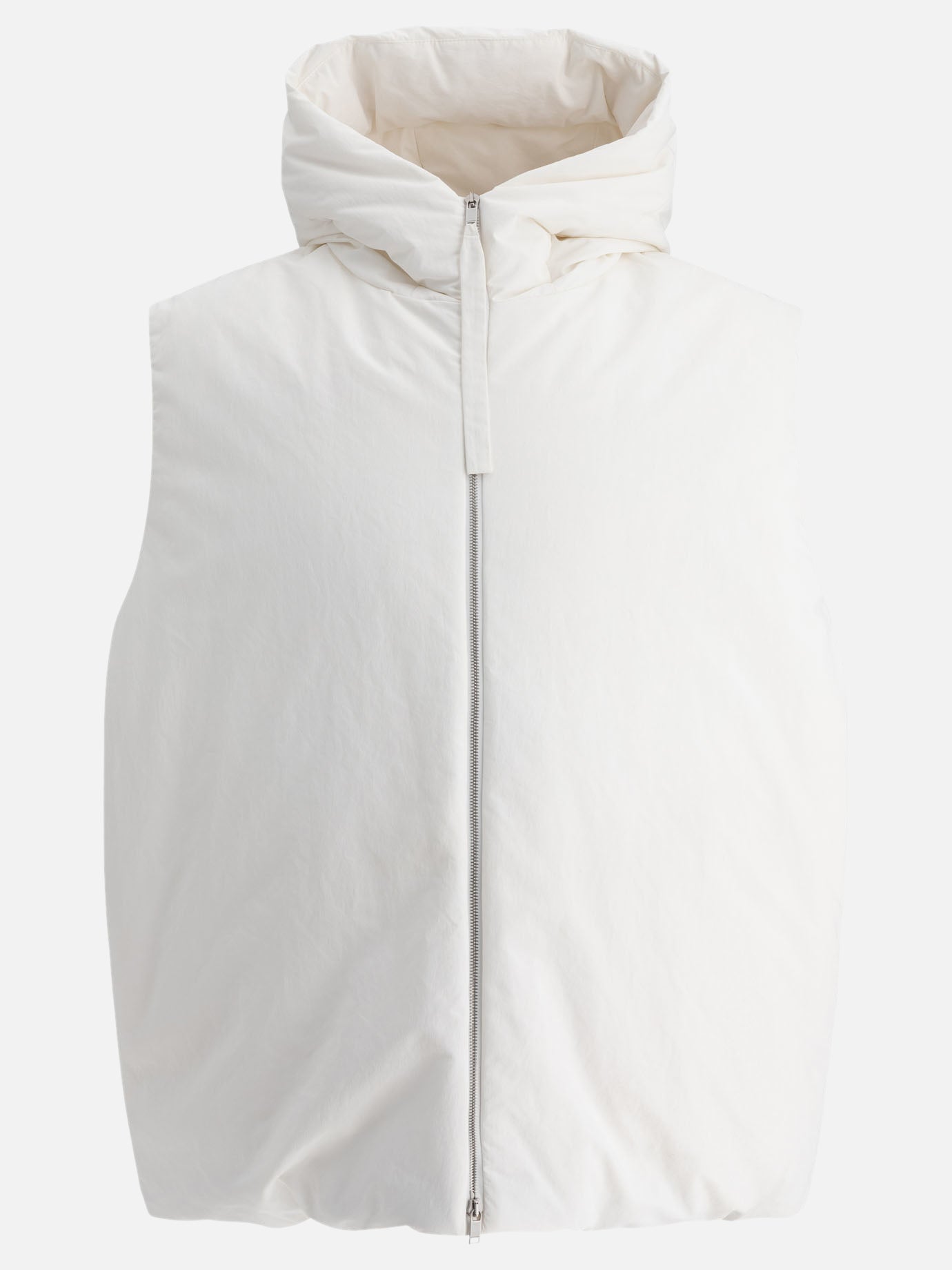 The Jil Sander brand presents a stylish padded sleeveless jacket, perfect for the modern man who appreciates an understated and sophisticated style. With its solid color design, this garment ensures a refined look, ideal for those seeking comfort without sacrificing elegance. The relaxed fit makes it suitable for wearing in a variety of contexts, both casual and semi-formal.
