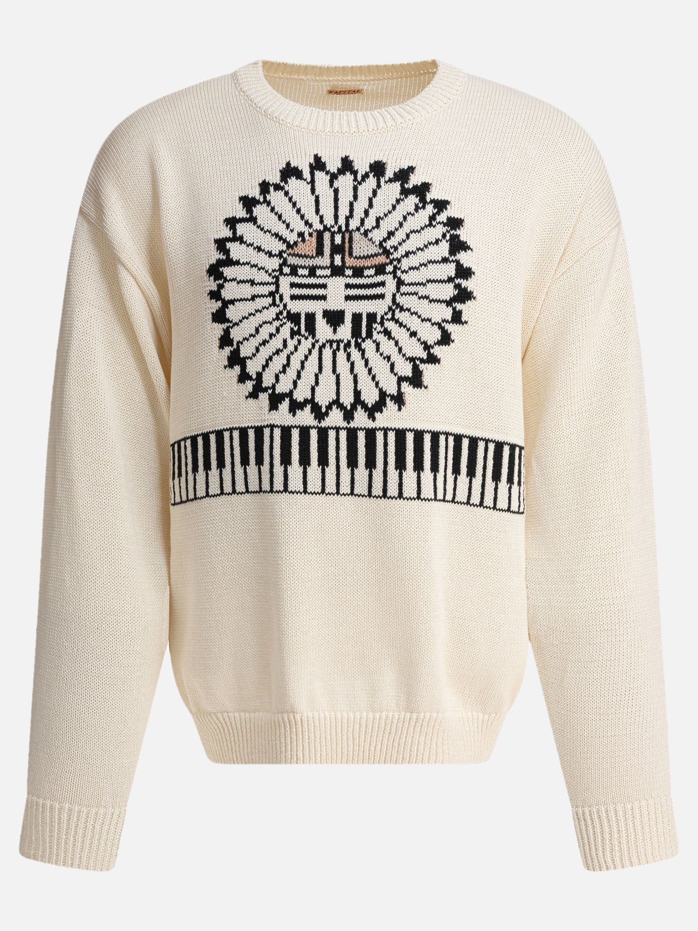 KAPITAL's "Piano & Sun Face" sweater is the perfect expression of creativity and comfort for the contemporary man. This unique garment combines art and fashion, giving a distinctive touch to the wardrobe of those who appreciate refined details and craftsmanship. Its exclusive design pays homage to the beauty of nature and the harmony of music.