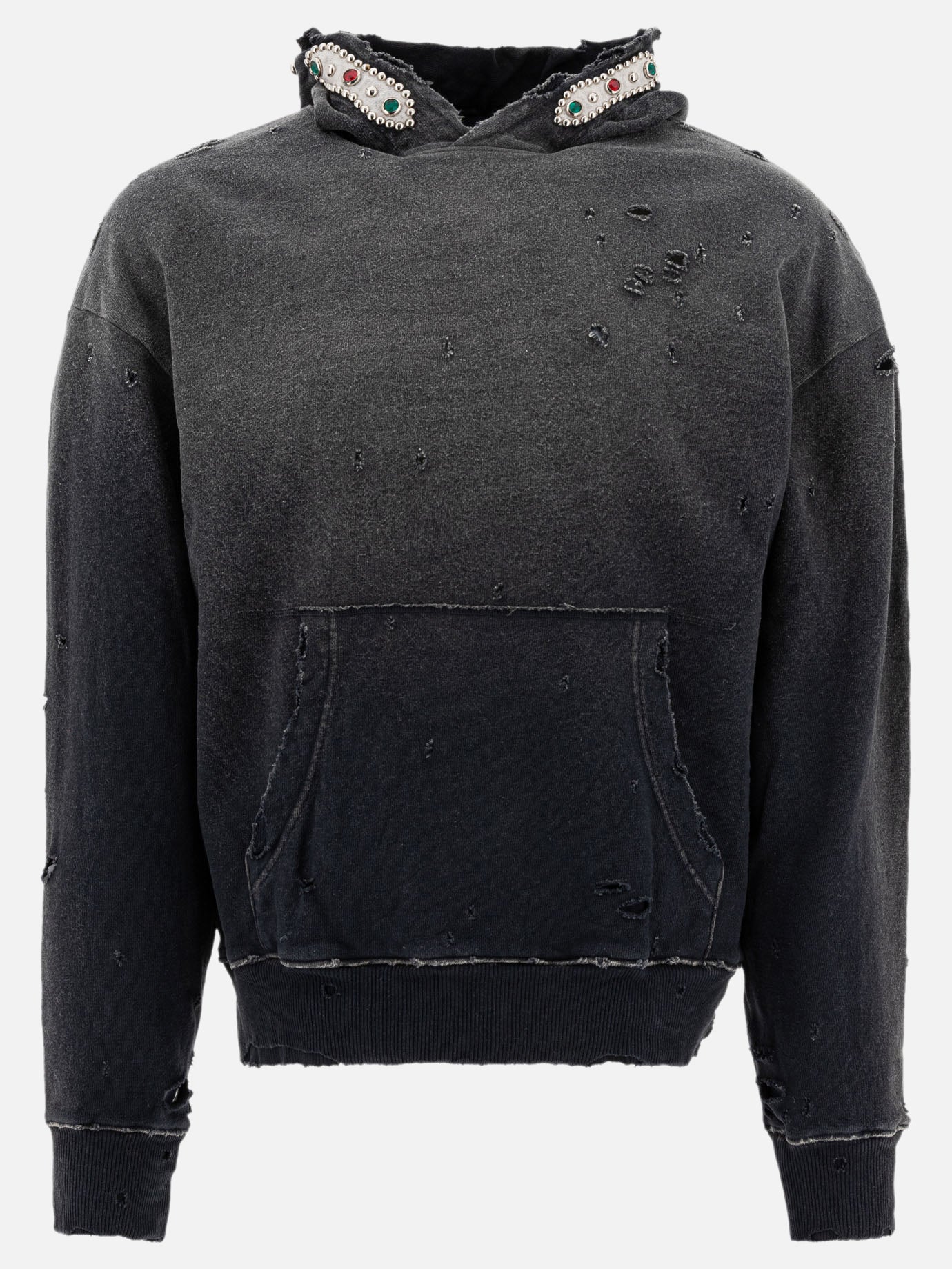 Discover KAPITAL's "Studs Thriller Distressed" hoodie, a unique garment for those who love vintage style with character. Ideal for the modern man who seeks comfort without sacrificing casual elegance. This solid-colored sweatshirt with relaxed fit stands out for its ability to combine fashion and functionality in one versatile and distinctive garment.