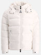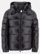 Moncler "Maya" Down Jacket. Made of boudin-quilted nylon technique, this short down jacket features a padded construction and a silhouette defined by fitted shoulders and chest and boxy waist. A removable hood with adjustment, léger nylon lining and zipper and snap-button closure outline the functional construction. Patch pocket with snap button on sleeve, adjustable drawstring hem.