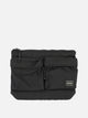 Porter-Yoshida & Co "Force" shoulder bag, made with a 210-denier 6 woven industrial nylon exterior, features a compact structure with a minimal silhouette and uniform surfaces. The design, inspired by military aesthetics, highlights subtle differences between the front pocket fabric and the body of the bag. The quilted ripstop nylon interior recalls the lining of military jackets and introduces a functional contrast in surfaces.