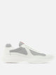Prada "America's Cup" sneaker, lace-up silhouette with structure that combines soft, durable leather with breathable bike fabric. The upper integrates details such as enameled metal eyelets and cotton laces. Voluminous rubber sole, lightweight thanks to lens-patterned foam material, supports the fit. Functional elements include red Prada label applied to tongue and removable leather-lined footbed.