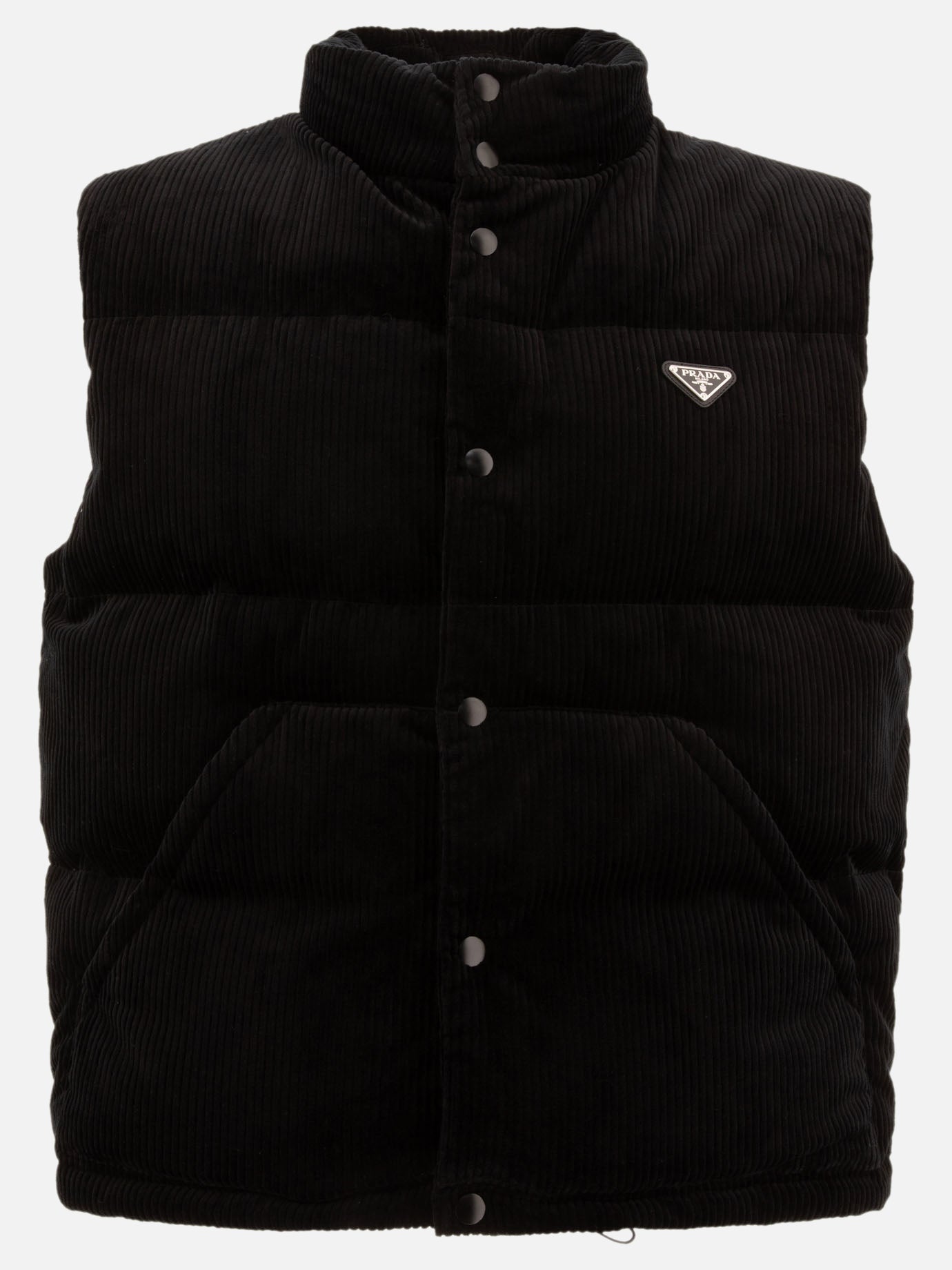 Prada's corduroy vest down jacket is the perfect synthesis of sporty functionality and aesthetic sophistication. Thanks to goose down filling, this garment offers warm comfort without sacrificing style, enriched by the enameled metal triangle logo on the front. Ideal for the contemporary man who seeks a sophisticated and versatile look, it is perfect for any casual occasion.