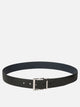 Prada reversible leather belt, constructed with smooth leather panels on both sides, featuring a semi-rigid structure and linear profile. The rectilinear silhouette features finished edges and a geometric metal buckle, attached via a pin closure. The reversible design allows for use on either side, with minimal tone-on-tone stitching and fixed loop adjacent to the buckle.