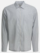 Prada striped zipper shirt made with a long-sleeved construction and classic collar. The construction features a front zipper closure and a patch pocket on the chest. Back yoke detail contributes to the definition of the straight silhouette. Fabric logo placed on front, main fabric unspecified. Clean finishes and regular seams emphasize the straightness of the garment.