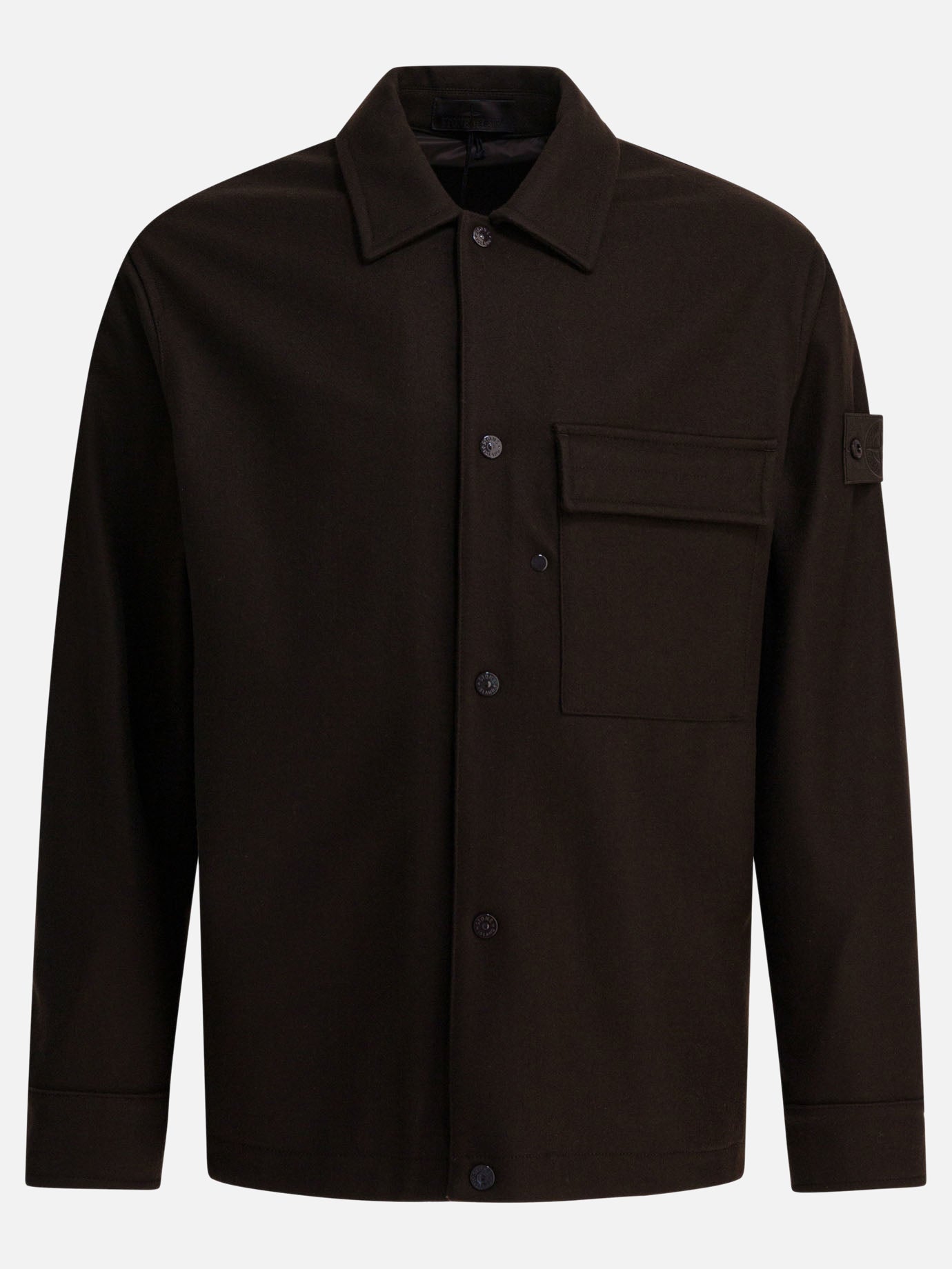 Stone Island wool overshirt jacket made with a shirt-like structure. The silhouette features long sleeves, classic collar and yoke in the back. The main fabric is a blend of 80% virgin wool and 20% polyamide. The front closure features snap buttons. Patch pockets on the chest add functionality, while the cuffs are adjusted by snaps. Tone-on-tone logo applied on the sleeve.
