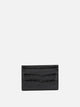 Tom Ford "Exotic Line" card case made of leather with crocodile print and glossy finish. Slim, compact structure features hard surfaces and sharp edges. Construction uses leather cuts juxtaposed with minimal stitching. The Tom Ford logo is embossed on the front. Interior trim includes parallel compartments designed for credit cards or business cards.