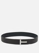 Tom Ford "T Icon" reversible belt, made with soft leather and double-sided construction that allows both sides to be worn. The silhouette is linear, with no visible seams at the top and bottom edges. The shiny metal T-shaped buckle is secured by a snap fastening system that ensures stable adjustment to the desired length. Rigid and compact structure, smooth finish throughout.
