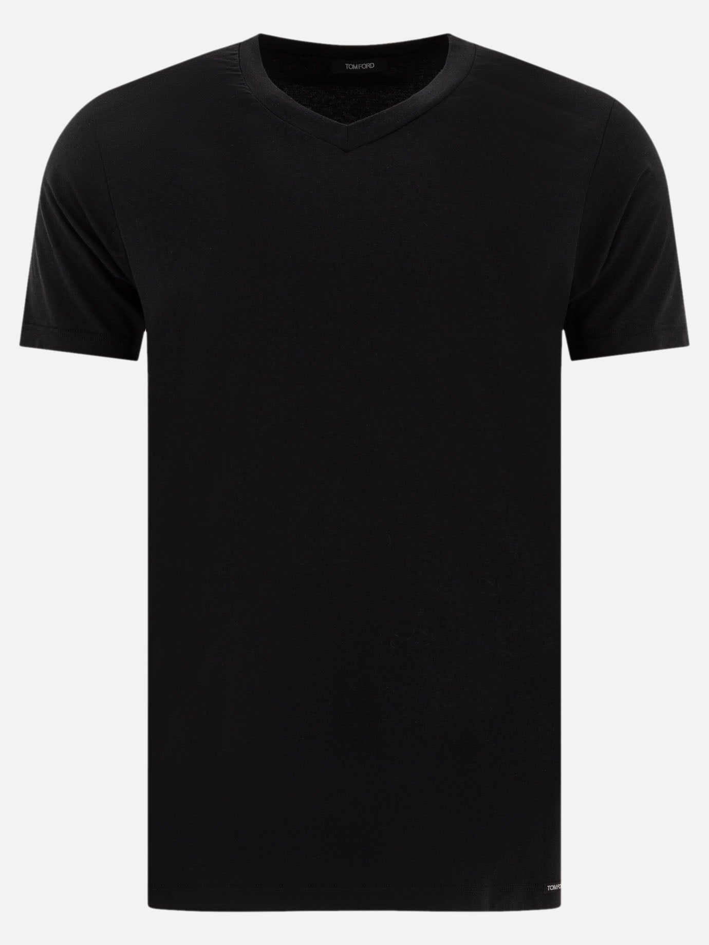 Tom Ford V-neck underwear T-shirt, made of jersey. Short-sleeved construction features a clean V-neckline and a small Tom Ford label applied to the bottom hem. Streamlined, essential silhouette designed for body-hugging fit without visible seams. Stretchy construction ensures tightness and flexibility.
