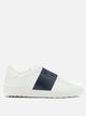 Valentino Garavani "Open" sneaker features a calf leather upper with a uniform surface and linear structure. The silhouette is rounded at the front, with a contrasting leather center band integrated into the construction. The closure is provided by flat laces, while the smooth rubber sole extends to the back, where rubber studs are applied as a functional detail. The inner lining is made entirely of leather.