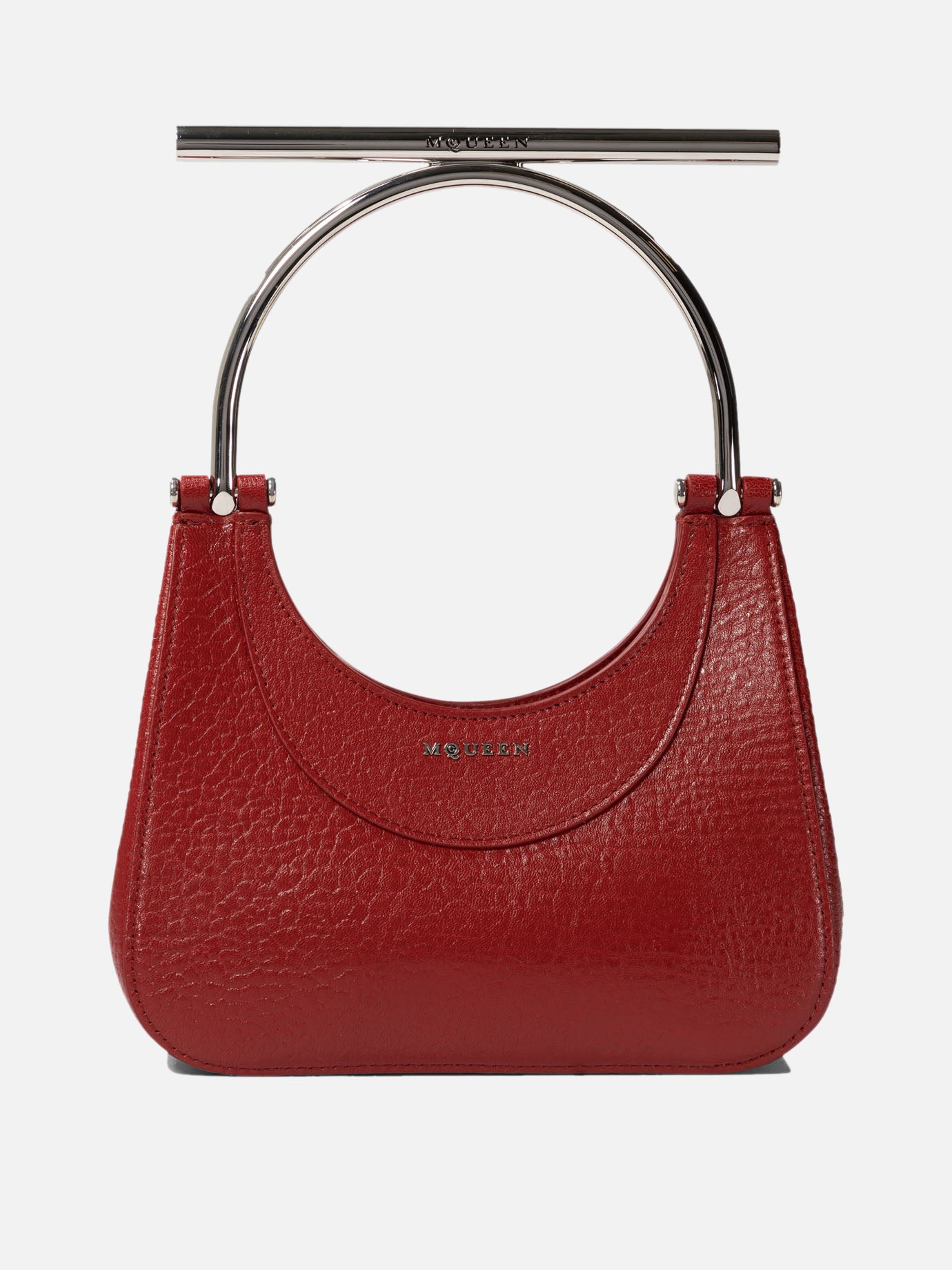 Discover the sophistication of Alexander McQueen's "Mini Cross-Bar" handbag. Made of fine red full-grain lambskin leather, this bag combines elegance and functionality with its soft, structured design, embellished with side pleats and an impressive iridescent circular handle with the McQueen logo. Perfect for any occasion, it can be carried either by hand or over the shoulder thanks to its removable metal chain strap.