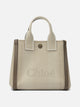 Chloé "Carry" tote shoulder bag made of striped jacquard canvas composed of 91 percent cotton, 6 percent polyester, 3 percent other fibers. The structure is defined by a rigid body with an adjustable silhouette via side magnets that allow for a compact, rounded configuration. Vertical bands of calfskin leather and oversize logo characterize the exterior trim. Double handles and adjustable shoulder strap allow for shoulder or hand carry.
