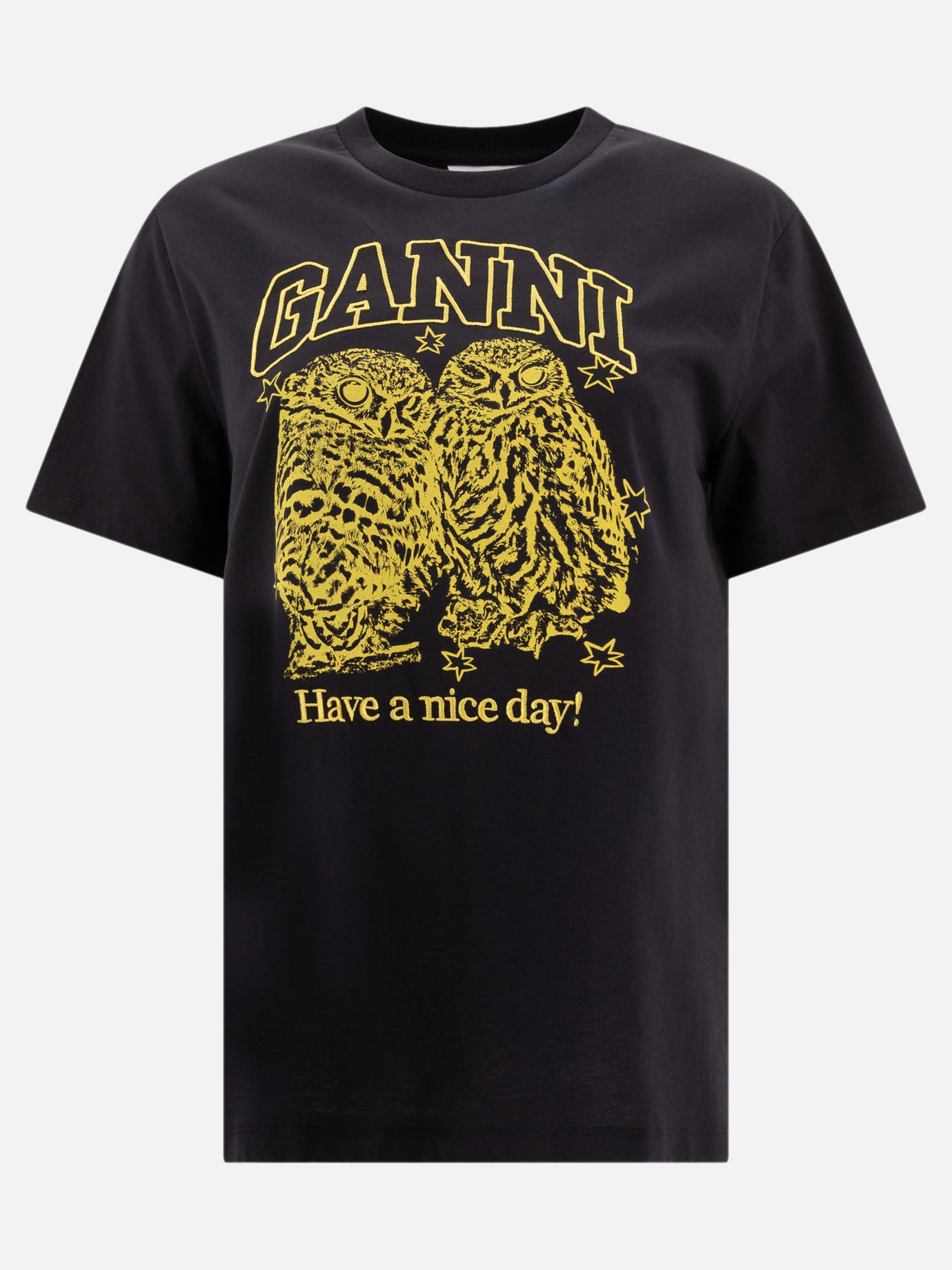 The Ganni cotton jersey T-shirt combines comfort and style with its relaxed fit, perfect for any occasion. The graphic Owls print and printed GANNI logo offer a unique touch to this women's wardrobe essential. The versatile design makes it ideal for creating casual and contemporary looks.