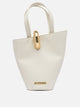 The "Bambola" bucket bag by Jacquemus represents a meeting of practicality and refined design, designed to accompany the modern woman in style. The iconic silhouette and attention to detail, such as the plated metal clasp ring, make this accessory a distinctive element for those who like to stand out in everyday life. The bag's clean lines and functionality fit perfectly with the dynamic pace of the day, reflecting timeless elegance.