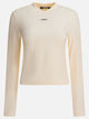 Jacquemus "Gros Grain" long-sleeved T-shirt with fitted construction in stretch cotton. The main fabric, composed mainly of cotton with a percentage of elastane, gives elasticity and a compact structure. The essential silhouette features long sleeves and a ribbed crew neck. An embroidered grosgrain logo is applied to the chest, visible as a textural detail on the front surface. The finish features sharp edging and regular stitching.