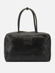 Miu Miu "Beau" handbag, made of smooth, soft leather with rigid structure and compact silhouette. Leather handles allow for both hand and shoulder carry. Gold-finish metallic elements intervene in the functional and decorative details, including the front embossed lettering logo. A zippered closure secures the structure, while the interior is finished in cotton satin with double zippered pockets.
