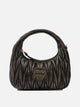Miu Miu "Hobo Wander" handbag, made of matelassé nappa leather with three-dimensional workmanship. The construction features soft silhouette with hobo shape and compact structure. The bag integrates a 110 cm removable leather shoulder strap and features metal hardware. Metal lettering logo is placed on the front side. Zipper top closure and cotton satin-lined interior. Suitable for holding a phone and small wallet.