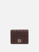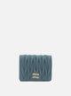 Miu Miu matelassé nappa leather wallet, constructed from leather worked with a three-dimensional pattern, features a compact silhouette and rigid structure. The product integrates a snap-button closure, finished edges and embossed lettering logo applied on the surface. The interior is organized with multiplicity of compartments designed to accommodate banknotes, cards and coins. The interior lining is made of moiré fabric.