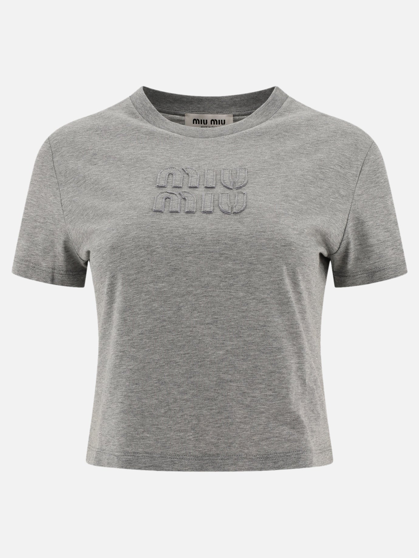 Made of soft garment-dyed jersey, the Miu Miu embroidered logo T-shirt is a symbol of minimalist elegance. This essential design creation is distinguished by its regular fit and high-quality finish, making it an iconic and timeless piece for any woman's wardrobe.
