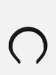 Miu Miu velvet headband, semi-rigid construction with velvet lining and application of luminous elements on the surface. Gold lettering logo finished in relief is located on one side, integrated into the structure. The rounded silhouette offers a thick and defined silhouette, maintained by a stable inner core. Set crystals create reflections and visible details along the upper arch.