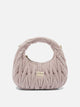 Miu Miu matelassé velvet "Wander" handbag, made in a mini version with a three-dimensional effect matelassé workmanship. The compact structure features a hobo silhouette with a curved profile and a soft body enlivened by the geometric texture. The adjustable leather shoulder strap also allows it to be worn over the shoulder. Metal lettering logo is applied on the front, while the top closure is zipped.