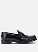 Prada brushed leather moccasins with one-piece construction and essential lines. The upper is made of calfskin leather, finished with mirror work and clean structural details. The silhouette features a squared profile, interrupted by the central leather-applied horsebit. The handcrafted assembly defines regular volume and stable geometry. The sole is made of compact rubber with regular transitions and one-piece profile.