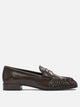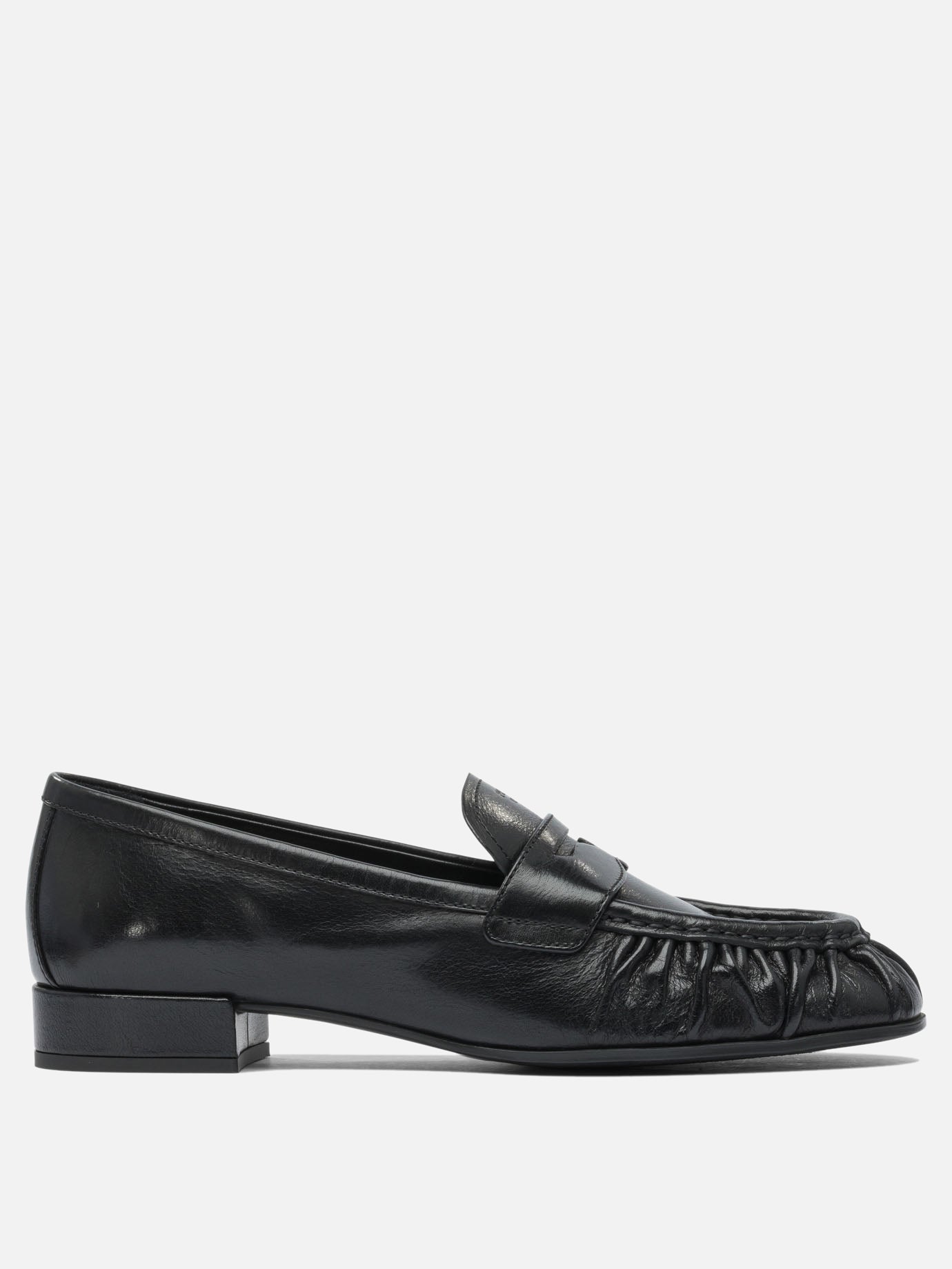 Prada leather loafers made with leather upper and brushed finish. Square toe and construction with traditional moccasin stitching along edges. Front band with a penny strap and applied lettering logo detail. Leather lining and insole. Sole composed primarily of rubber with leather inserts, contoured to promote traction and stability.