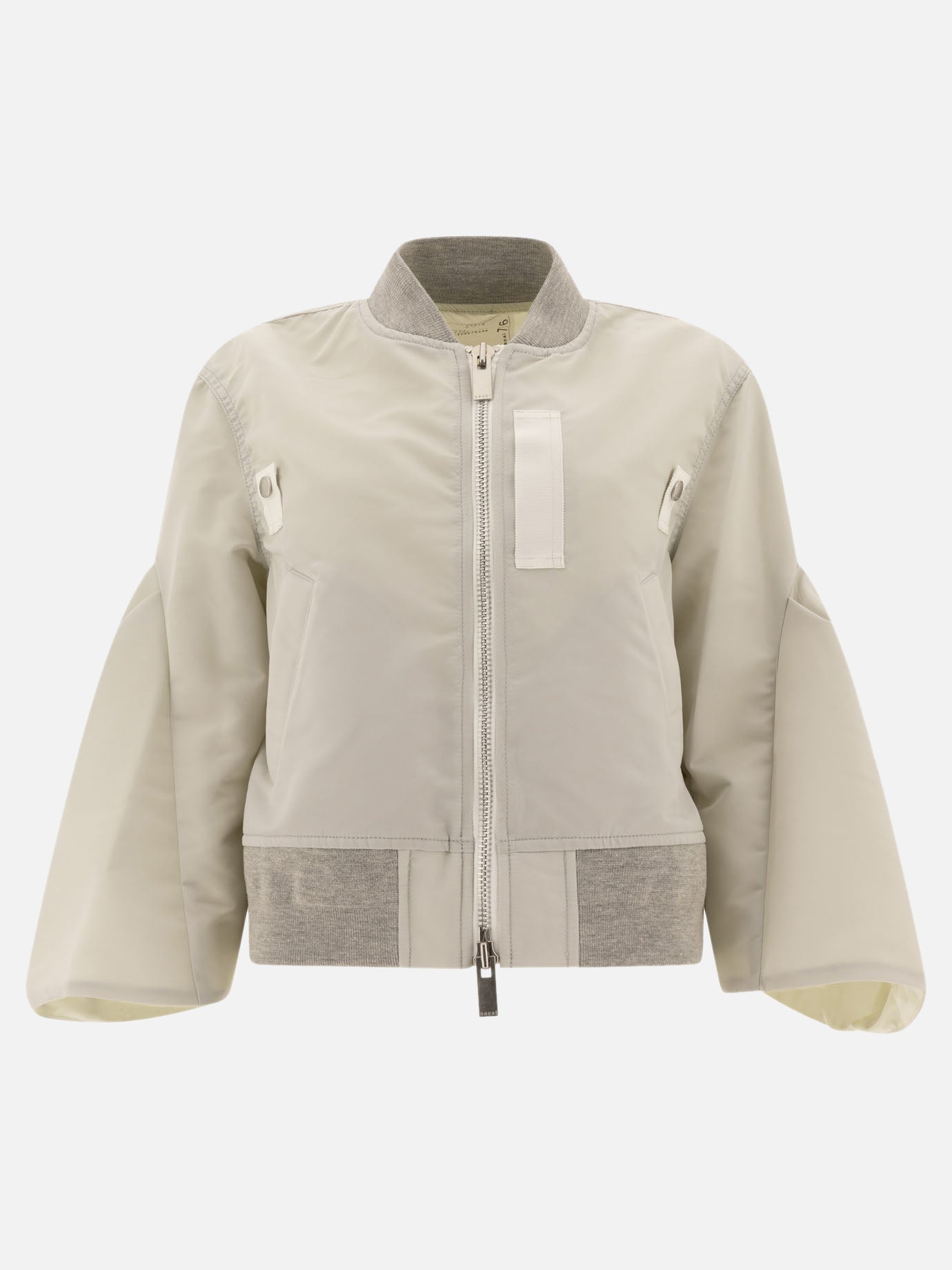 Sacai's nylon cropped bomber jacket is a garment for women that blends elegance and functionality. Crafted with a fashionable design and durable construction, this boxy-cut bomber jacket offers comfort without compromising on sophistication. Its solid color and long sleeves make it a versatile addition to any wardrobe, perfect for adding a contemporary touch to any look.